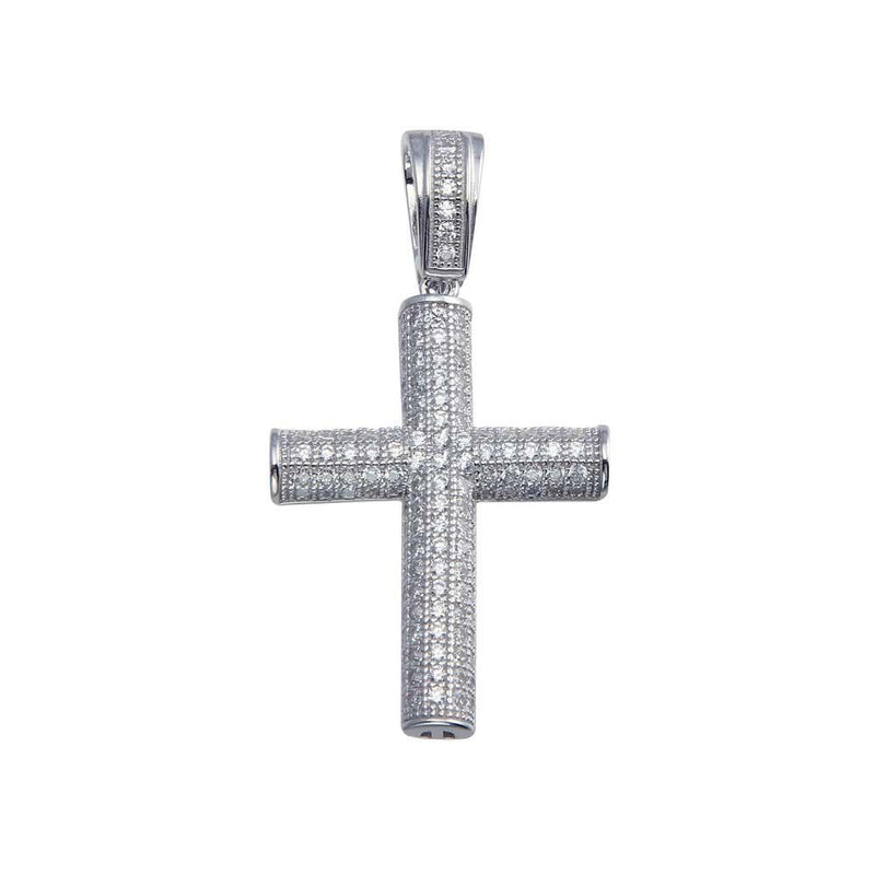 Sterling Silver Rhodium CZ Tube Cross Pendant | Religious Charm