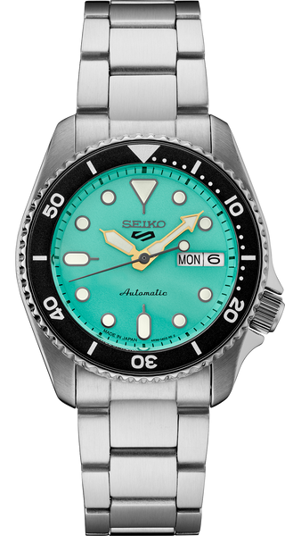 Discover the Gents Seiko 5 Sports automatic watch in a versatile 38mm case size. Features a striking teal dial, durable stainless steel bracelet, automatic movement, and a 41-hour power reserve. A perfect everyday timepiece.