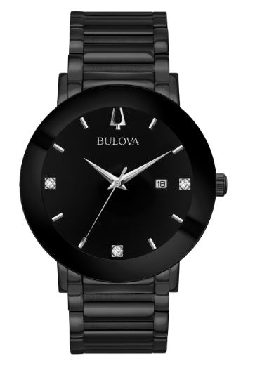 In black IP stainless steel with three diamonds on black dial, three-hand date feature, metalized edge-to-edge curved crystal, screw-back case, black IP stainless steel bracelet with deployment closure.