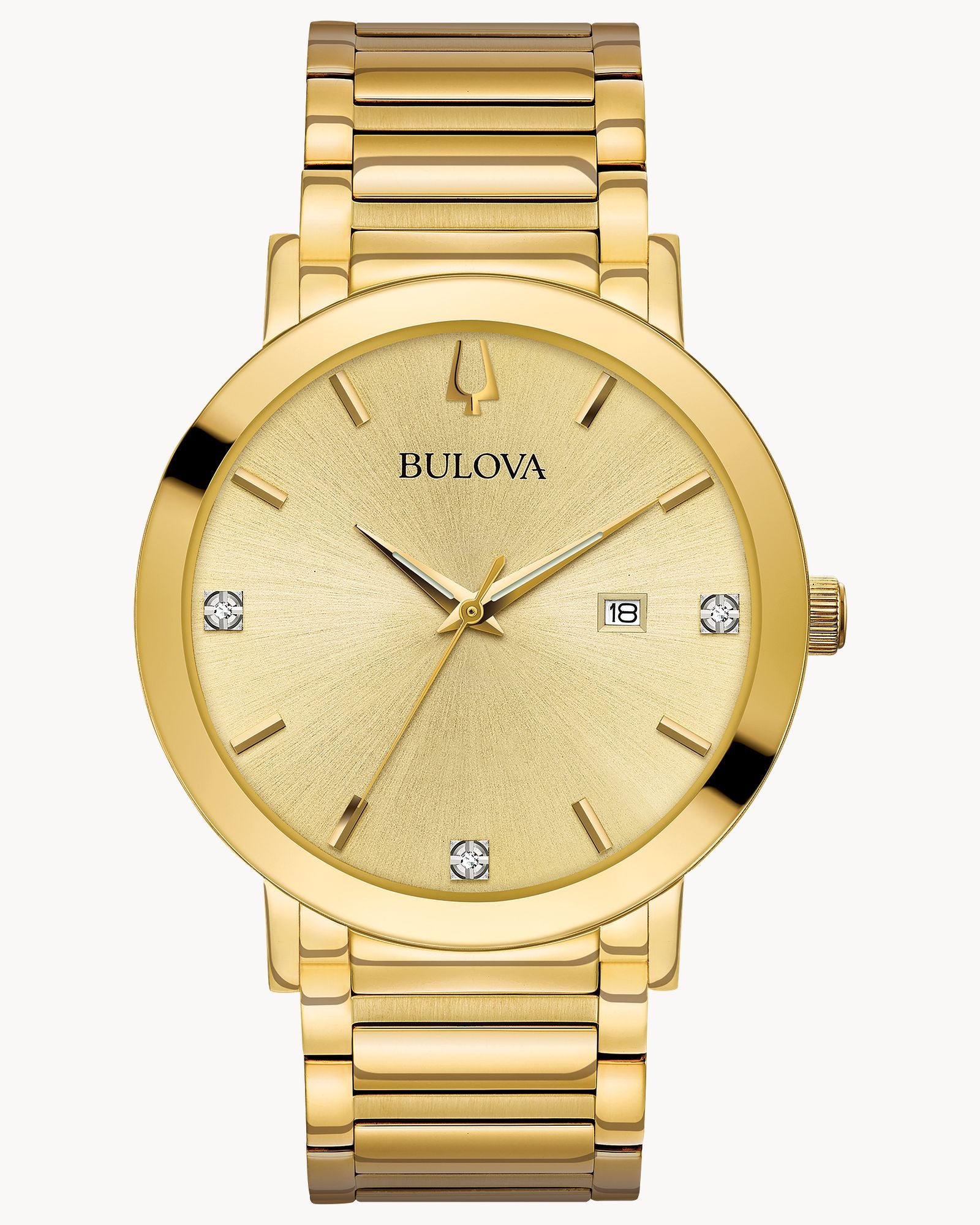 Explore this elegant 42mm men's quartz watch featuring a striking gold dial, diamond accents, and a luxurious stainless steel yellow gold-plated case and bracelet.