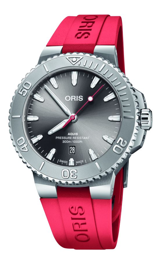 Explore the robust 44MM men's Aquis Date Relief automatic diver watch, featuring a striking red rubber (caoutchouc) strap and durable stainless steel case. Designed for performance and style, perfect for aquatic adventures and everyday wear.