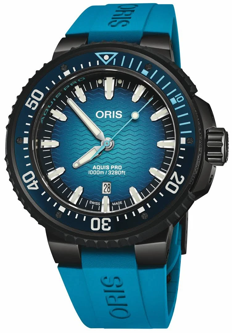 Shop the Oris Aquis Pro 1000M diver's watch featuring a 49mm blue titanium case, 41-hour power reserve, and a durable rubber strap. Engineered for professional diving.