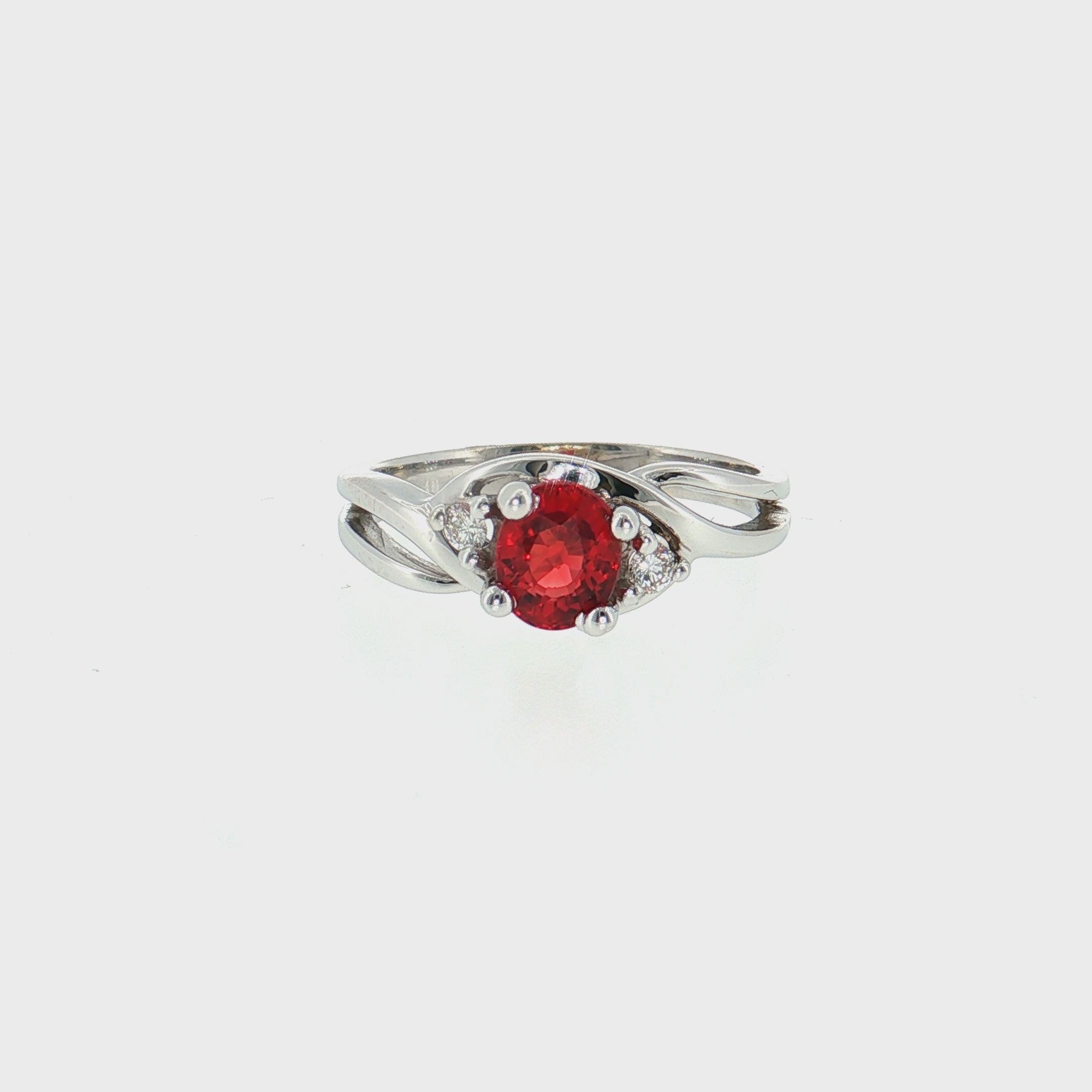 Shop this natural 14K white gold ring featuring an oval AA red sapphire and 0.05ctw diamonds. A symbolic three stone design for anniversaries.