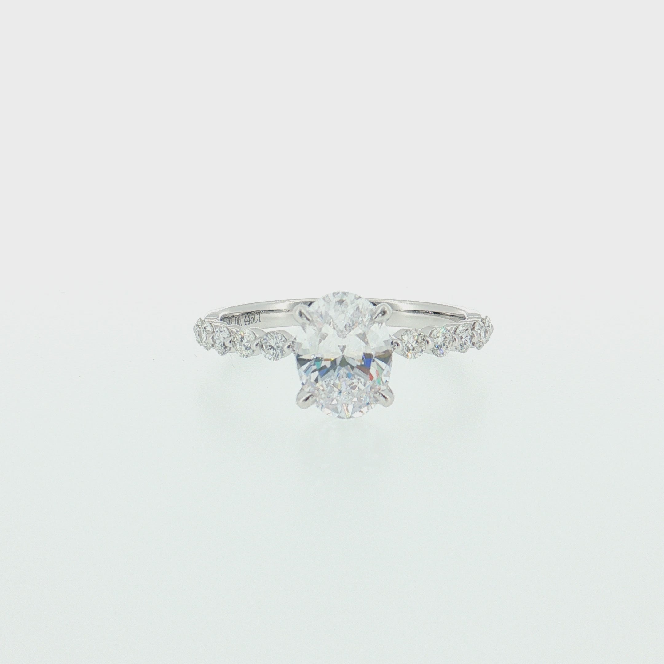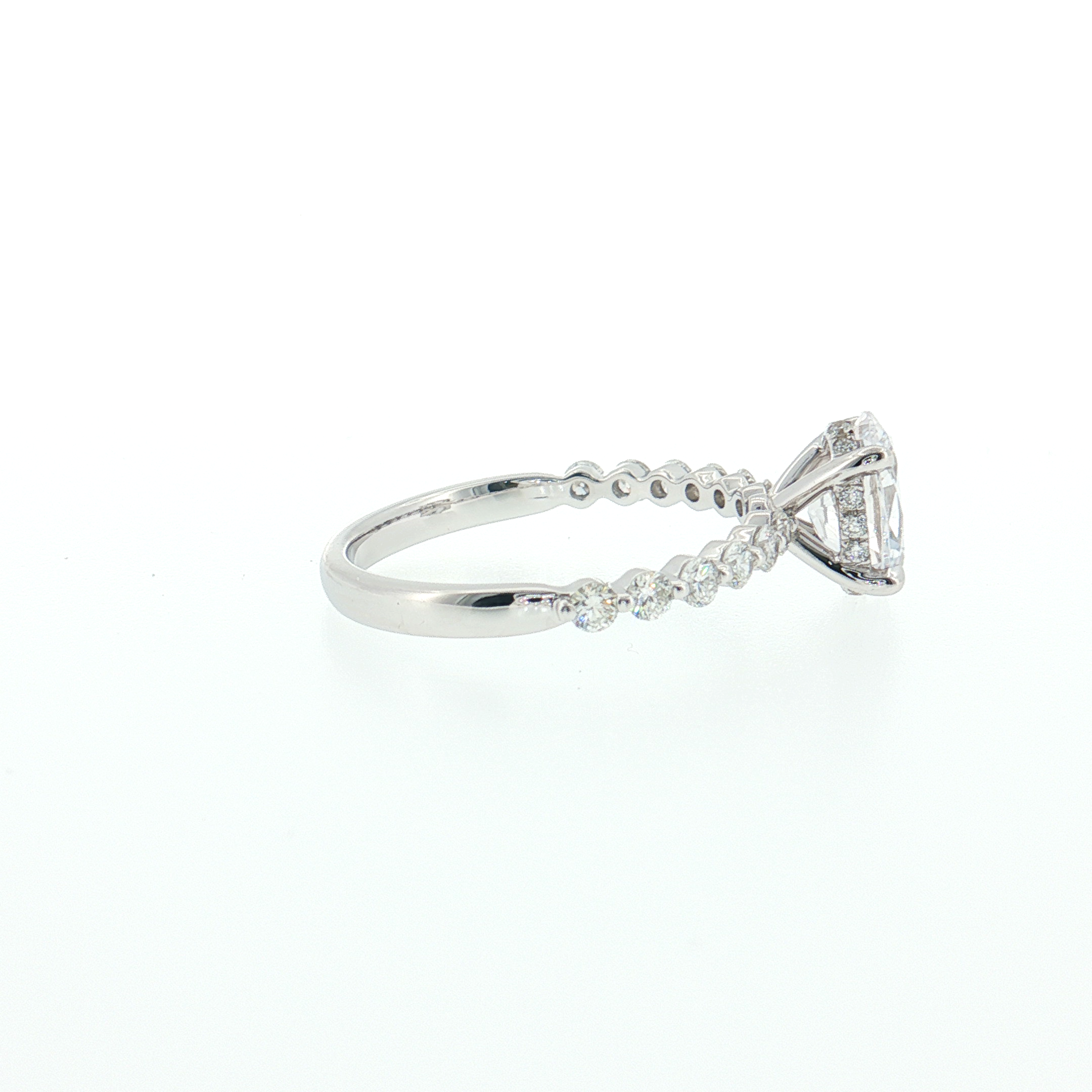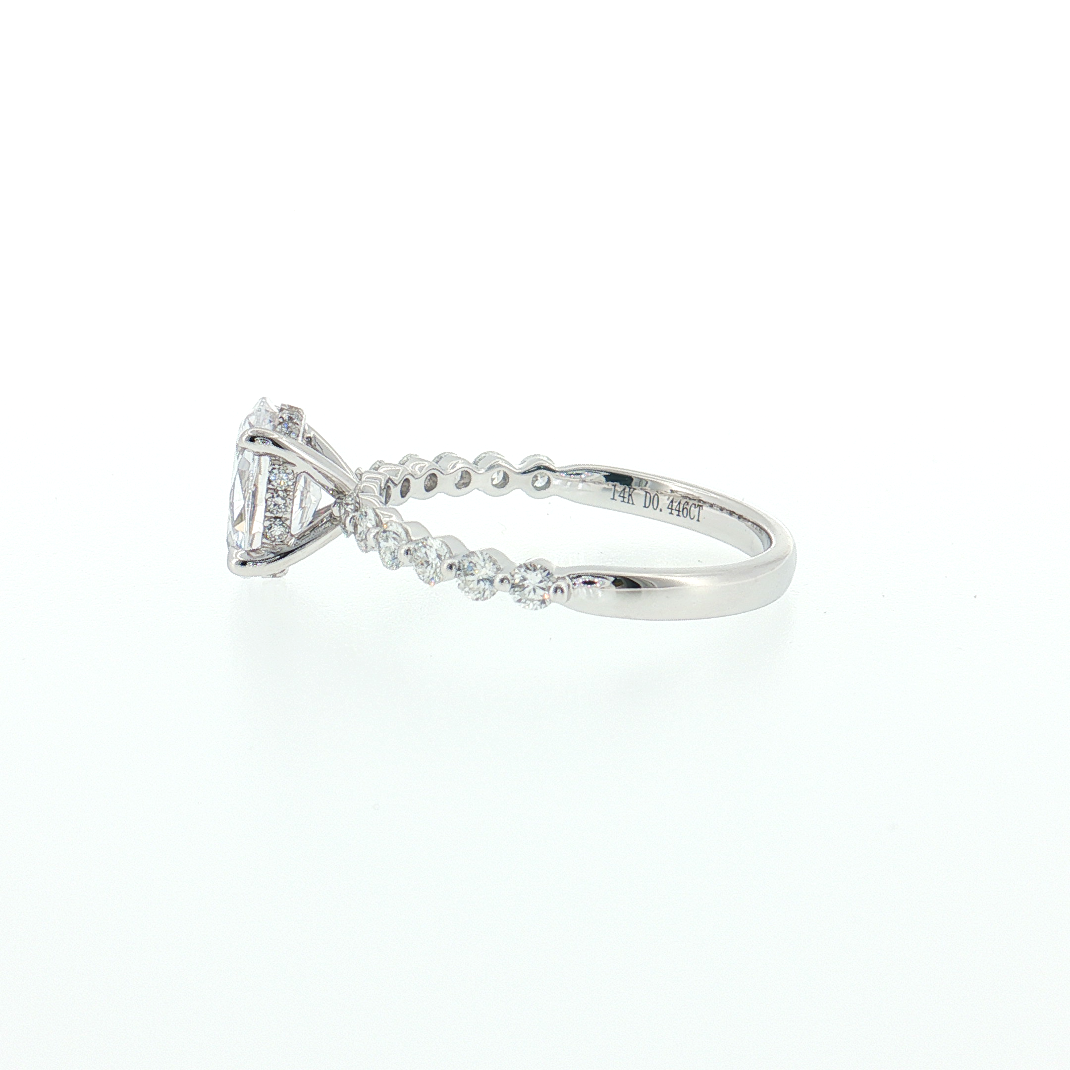 Shop our 14kt white gold hidden halo semi-mount. Features 0.45ctw of natural round diamonds in a shared prong setting. Fits 1.50ct oval center stones.