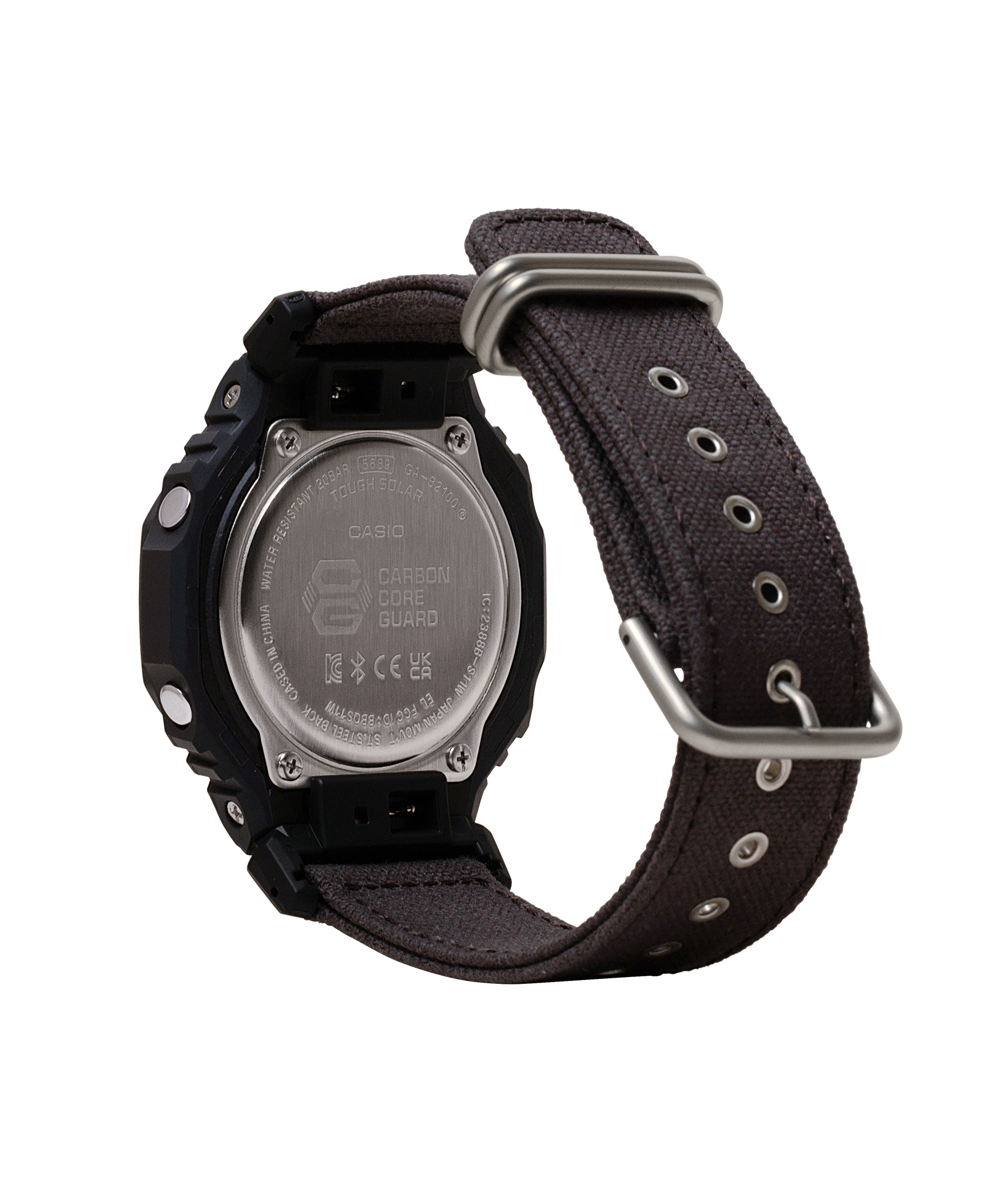 Shop the G-Shock 2100 Series with Tough Solar, Bluetooth link, and a durable black nylon strap. This 45mm "CasiOak" features a sleek resin case and 20-bar water resistance. Tactical style meets smart technology.