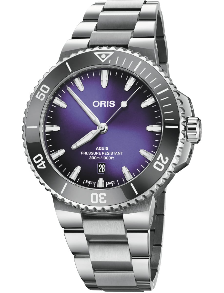 Shop the Oris Aquis Date Taste of Summer men's automatic watch. Features a vibrant violet dial, robust 44mm stainless steel case, and 300m water resistance. A versatile dive watch perfect for any occasion.