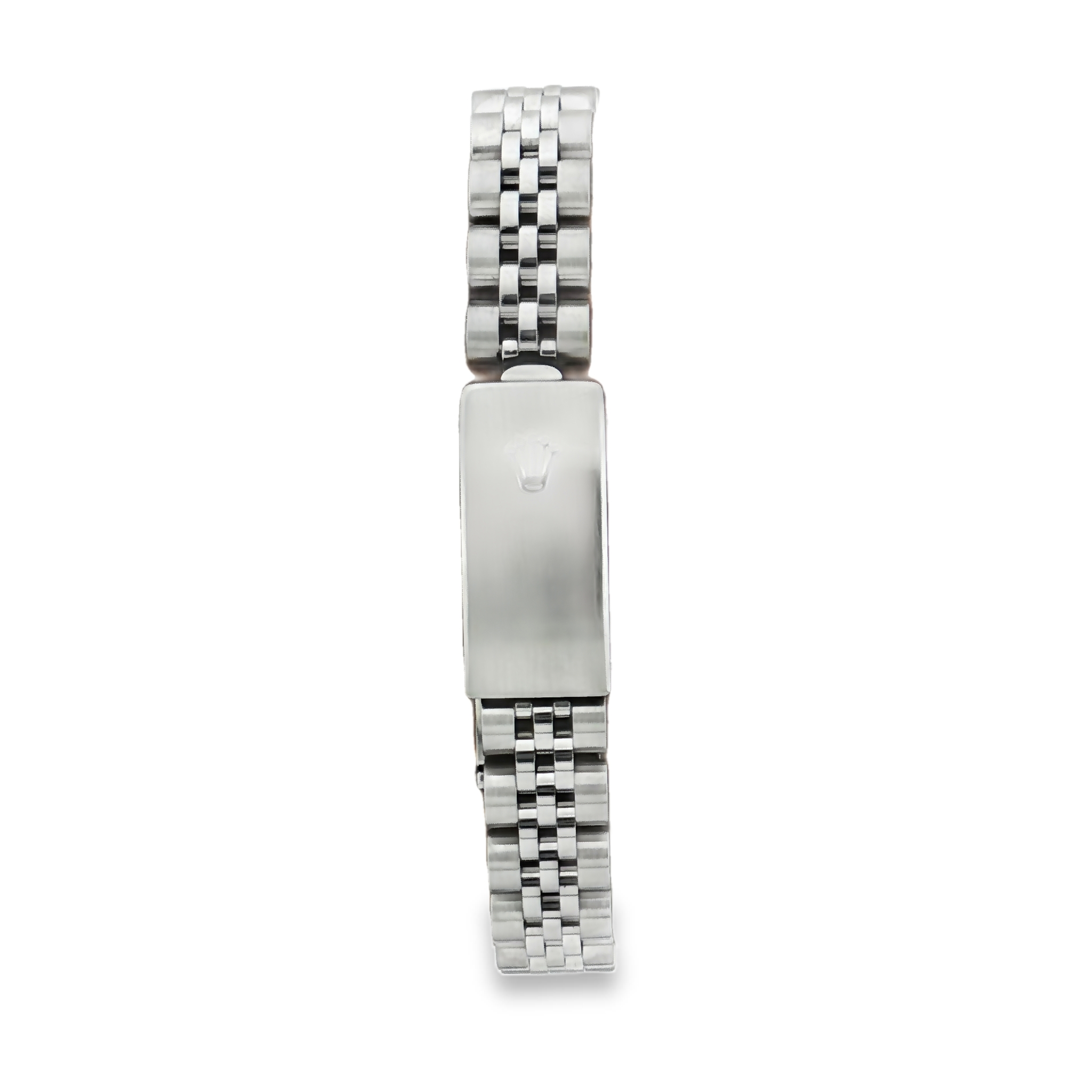 Shop this certified pre-owned 2003 Lady's Rolex 79174 Datejust watch featuring a 26mm stainless steel case, Mother-of-Pearl dial with diamond markers, and an automatic movement on a classic bracelet band.