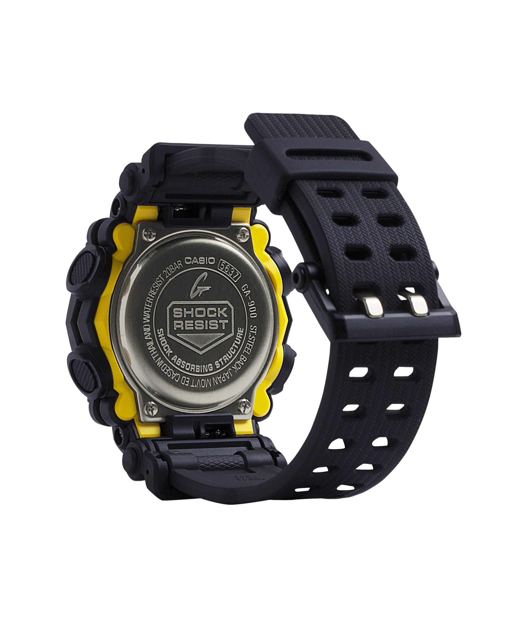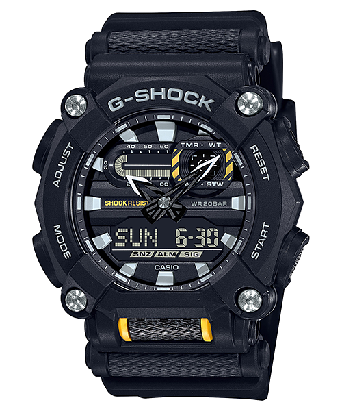Shop the G-Shock GA-900 in black with bold yellow accents. This 50mm industrial-inspired watch features an analog-digital display, 7-year battery life, and 20-bar water resistance. Built for heavy-duty toughness.