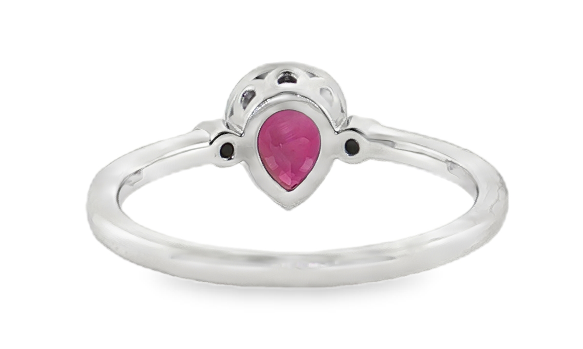 Lady's 14 Karat White Gold Ring featuring a Bezel-Set Pear-Shape Ruby and Diamond Accents